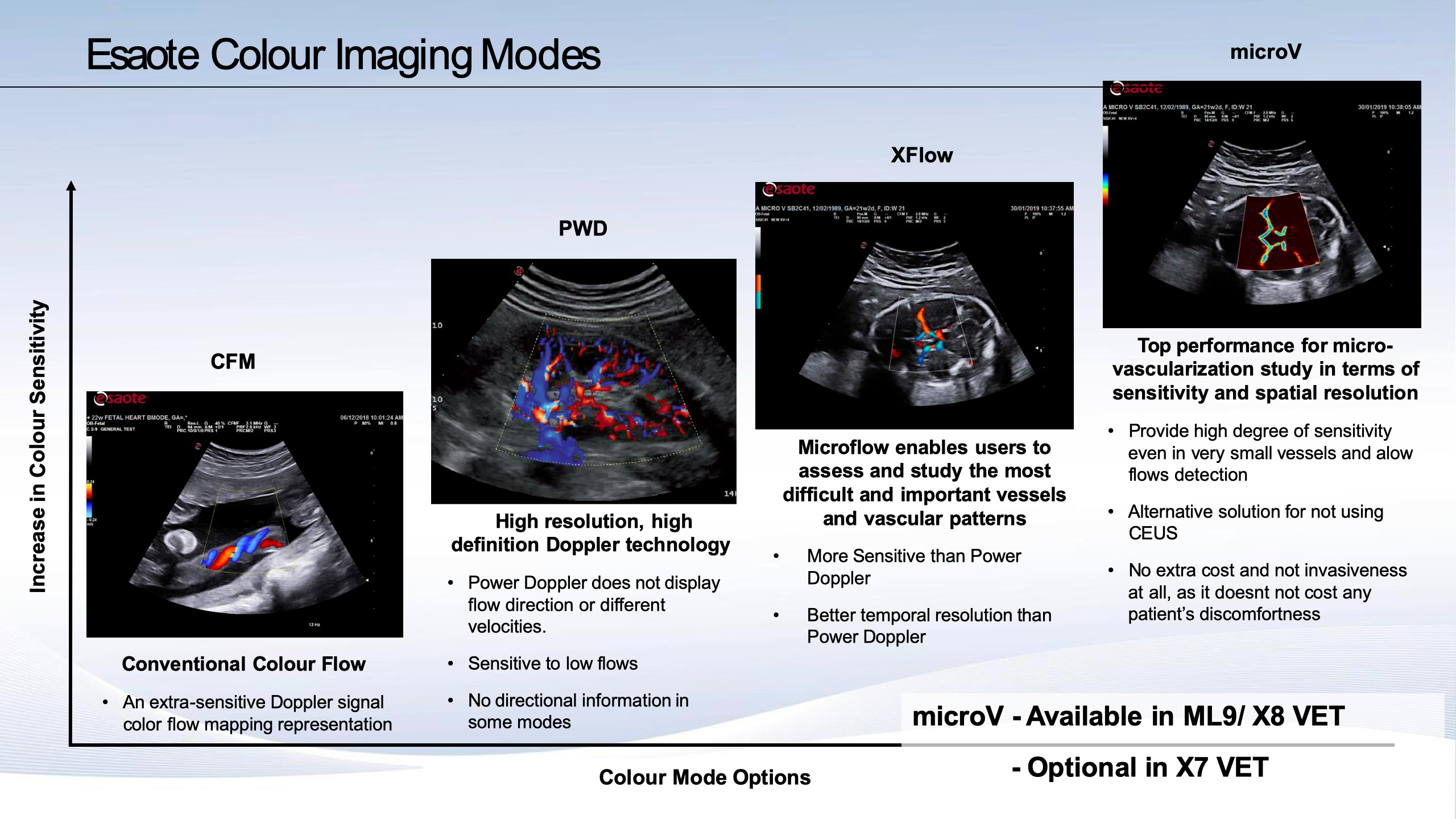X-View 2.0 fremhever hver eneste piksel, fjerner støy i bildet og forsterker overganger mellom strukturer. Dette gir en utrolig skarphet i bildet og hjelper deg å se hver eneste detalj. M-View 3.0 styrer signalene i flere retninger og legger informasjonen til bildet. Denne utrolige effekten reduserer artefakter og støy i tillegg til å forsterke bildeklarheten. Esaote er kjent for en ekstremt følsom farge – og powerdoppler og leveres nå i tillegg med MicroV. Alle modaliteter kan man styre signalet i ønsket retning, farge og følsomhet. Velg ønsket modul og du vil se mye der du tidligere ikke fikk frem dopplerinformasjon.