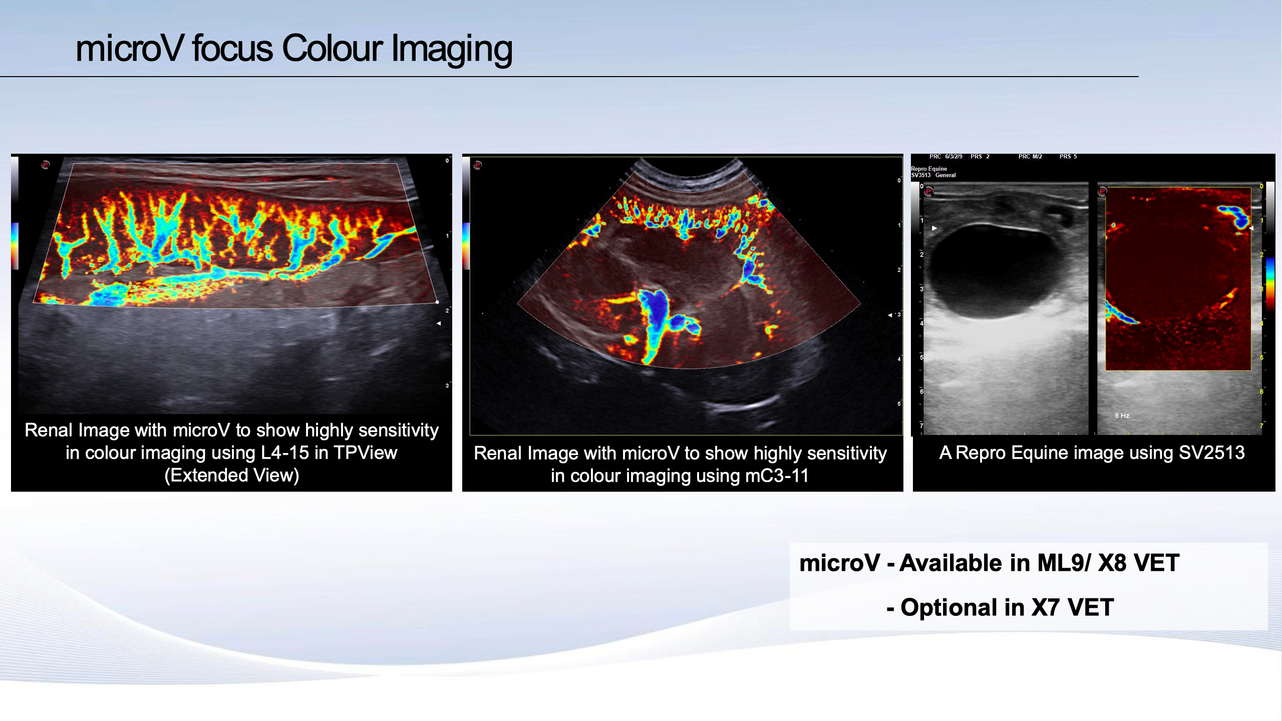 MicroV, den nyeste dopplerteknologien fra Esaote med en enestående følsomhet selv i små kar og deteksjon av lave hastigheter. MicroV er en algoritme som helt overlegent separerer bevegelse av væske fra andre bevegelser som skaper forstyrrelser. Dette gir en helt unik dopplerfølsomhet ikke sett tidligere. Med MicroV er det mulig å endre visualiserings algoritme for å forsterke ytterligere det du ønsker å se.