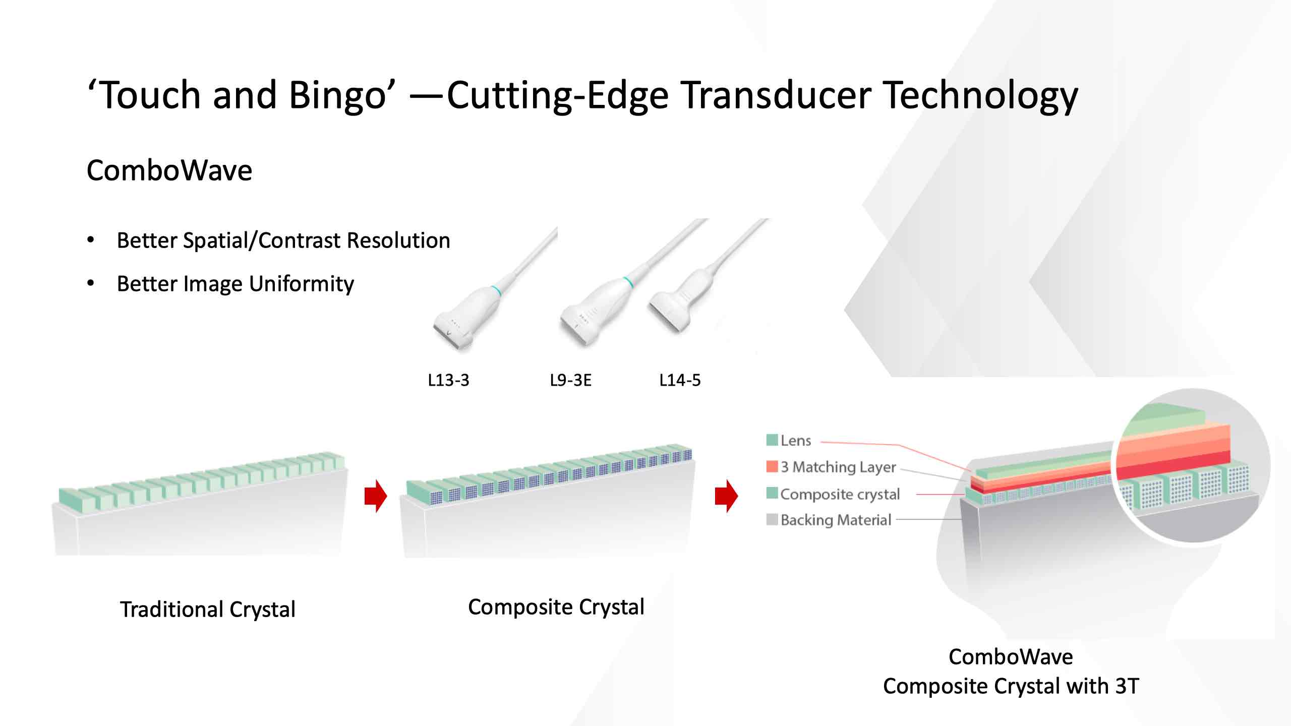 Kombinert med Mindrays unike 3T-teknologi (Triple-matching layers, Total-cut design, Thermal Control), gir de optimaliserte konvekse, phased array- og volumtransduserne en bredere applikasjonsdekning, noe som resulterer i en optimal skanneløsning innen abdomen, kardiologi, OB/GYN og mer.