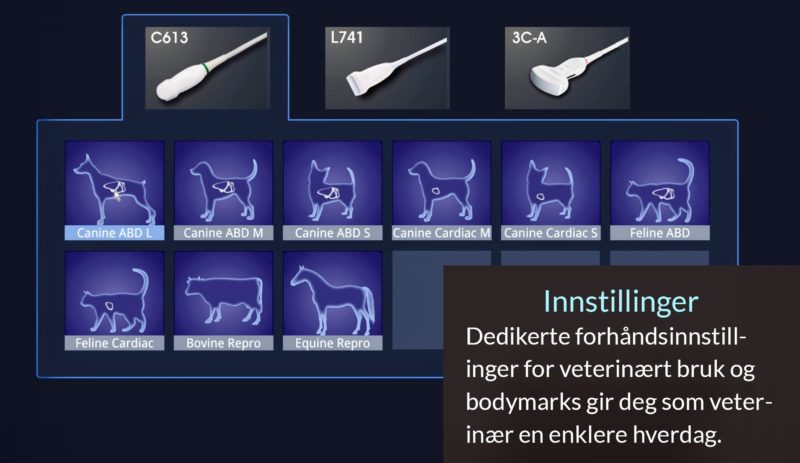 Apparatet kommer som standard med komplett program-og kalkulasjonspakke for veterinærpraksis inkludert; Generell, Abdomen, OB/Gyn, Urologi, Hjerte, Kar, MSK, Lunge, m.v. Alle lisensene er inkludert som standard på apparatet.