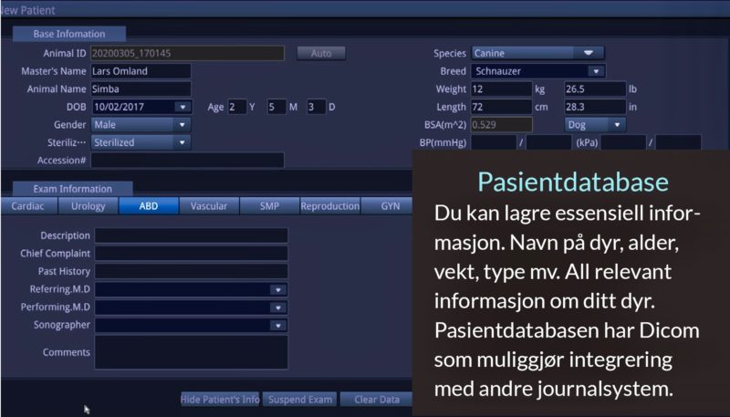 Sonoscape X3VET, leveres med komplett oppsett for veterinær ultralyd. Arkiv kan lagre dyrets og eiers navn. Apparatet leveres med veterinære forhåndsinstillinger og grafikk. Programvare for ultralyd av lever, milt, nyrer, vesica, uterus/drektighet, pancreas, binyrer, ventrikkel, tarm, lymfeknuter og prostata. Lisensen er vederlagsfri og leveres med apparatet.