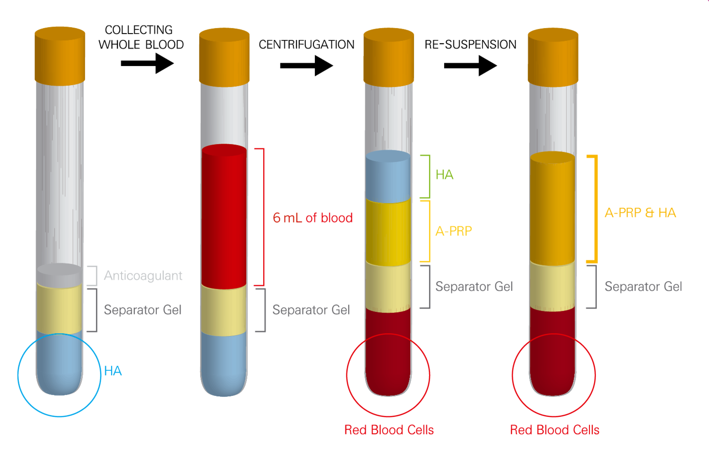 PRP blir preparert i sammensetning med høy kvalitets HA som produseres av RegenLab gjennom en bakteriell