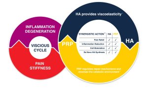 fermentasjon. HA skaper et cellevennlig miljø hvor blodplater kan samle seg. Dette biologiske, sammensatte nettverket av PRP og HA fasiliterer cellemigrasjon og cellespredning i det injiserte område. HA sørger for viskoelastisitet, øker effekten av og stabiliserer vekstfaktorene i PRP. Den har kapasiteten til å binde til seg opp til 1000x vannmengden av sitt eget volum. HA er veldig godt egnet i behandlingen av OA, samtidig som det også er bevist at effekten av HA ikke er langvarig. Derfor blir kombinasjonen av PRP og HA den beste, fordi PRP vil optimalisere vevet og HA sørger for at forholdene for dette ligger best mulig til rette. Den katabolske prosessen av inflammasjon og degenerasjon som induserer smerte og stivhet, blir snudd til å regenerativ prosess som regulere inflammasjonen og letter på symptomer. PRP og HA har en god effekt på symptomatisk leddsmerte og på mobilitet. Det er stor evidens for at synergien mellom disse to er utelukkende positivt. Det finnes flere studier som har forsket på sammenhengen mellom PRP og HA. Se mer informasjon under våre dokumenter eller henvend deg til Adcare.
