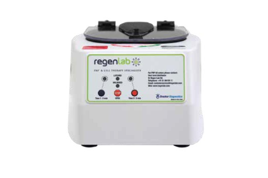 Sammen med beholder og tilbehør, leverer RegenLab en sentrifuge spesialtilpasset for å sikre riktig, sikker og rask fremstilling av Cellular Matrix® PRP. Sentrifugalkraften er 1500G med 3400 omdreininger per minutt, ved 45 grader, som gir perfekt separasjon av blodplater, plasma og røde/hvite blodlegemer. Sentrifugen er ferdig på 5 minutter. Sentrifugen er lett å bruke, veier lite og tar lite plass på kontoret ditt. Kontakt oss for opplæring og spørsmål.