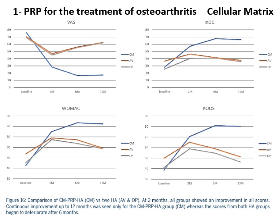 Randomisert studie; Barac et all 2018, viser sterk smertereduksjon og funksjonsforbedring ved anvending av Celular Matrix(CM) sammenlignet med 2 forskjellige HA(Hyaluronsyre) preparater. Se flere studier her